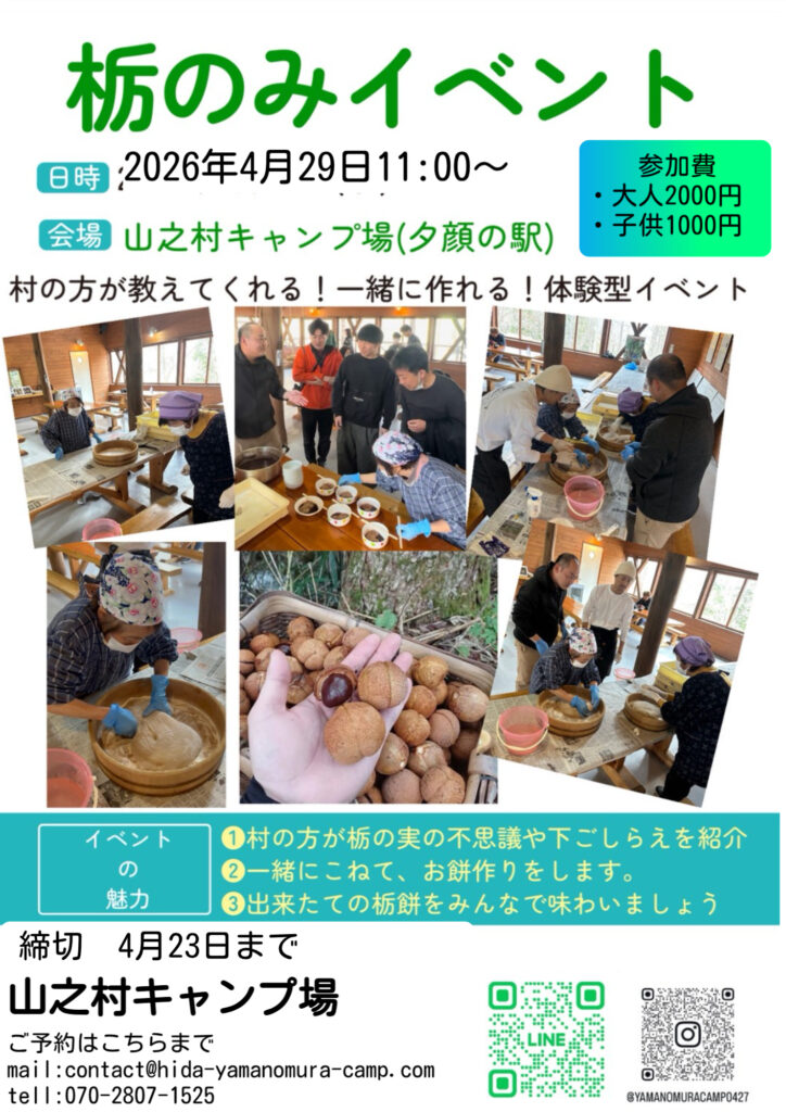 お電話(070-2807-1525)またはメール(contact@hida-yamanomura-camp.com)にてご予約くださいませ。
